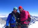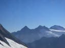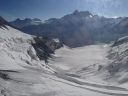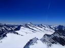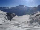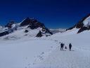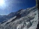 | ☆8月10日(土)メンヒ(4099m)は日本の日和田山?! 今日はメンヒ登山の日。ガイド協会でお願いした、スイス人ガイドエデイさんと、ユングフラウヨッホ鉄道駅で8時55分に待ち合わせ。 グリンデルワルト駅から青い電車に乗り終点のクライネシャイデックで降り、そこから、赤い登山電車に乗り換え、ユングフラウ鉄道に乗らなければならない。なんとかユングフラウ駅に着き、指定された喫茶店前で待っていると、エデイーさんらしき人がいたので、声をかける。ドンピシャ、だった。スイス人の顔形の特徴が大体なんとなくわかってきたので、探すのに苦労はなかった。荷物チエックがあり、「ベリーグード」と言われた。 ユングフラウヨッホの駅は観光化されており、いろいろな展示物が、各ブースに分かれて、配置されていた。鉄道百周年とかで、特別展示もされていた。 そういえば、電車の中で向かいに座った、「地球の歩き方」の本を片手にした若い日本の青年に、「僕も、今日登れますか?」と聞かれたが、いでたちからみて「無謀だと思う。ハイキングまでかな」と答えた。 本当に見境がないと、言うより登山者自らが自分で自己判断して自分のレベルを知って行動するようになっているのだ。「危険です」などという標識は一切ない国なのだ。 トンネル内を歩き、外に出ると、そこは素晴らしい雪の銀世界だった。犬も観光客も、子供も、ここから一時間ほどは雪上ハイキングが楽しめるようになっていた。その同じ道をメンヒに向かい歩く。 やがて、旗がはためいている個所で、登山組と展望台への引き返し組に分かれる。 ここで、ガイドはスタッカットとかコンテとかの単語を発したような気がしたが、要はロープを結ぶのだ。 ここからは雪の緩やかな登り道を登る。さらに進み、道を外れ左に折れたところで、岩稜登攀が始まる。「メンヒ」とガイドの指差す先に見える山に登るのだ。 アイゼンは付けたままである。登っていくと、日和田山のような岩感覚で、ドンドン歩ける。その上、高度順応が十分できていたので、楽すぎて、息も切れない。早く登りすぎてしまい、「スロウリー」「もっと遅くいけ!」と何度も指導された。岩稜帯は特にガイドの息があがっており、こちらは休まなくていいのに3回も休んだり、超のんびり、のんびりのルート歩きだった。 「ノリコ、どこでも止まって、自由に写真撮っていいよ。貴女の登り方は上手だ」とリップサービスをしてくれた。 ますますいい気分になって雪稜の所もドンドン登っていくと、右手に大きく見える山が「あれがアイガー」と教えてくれた。存在感のある山だ。 メンヒの頂上は今見えている岩の塊の頂点の奥にもう一つのピークがあり、そこが頂上だと教えてくれた。頂上までは、後、1時間足らずで着くだろう。あっという間に着いた。あっけないほどの時間だった。 頂上で休めと言われ、10分ほど休憩した。正直早く降り、違う山にも回りたかったので、「必要ない」のにと思ったが、「早く降りたい」ともいえず、ゆっくりのんびりと過ごす。写真もたくさん撮ってくれた。 景観も十分堪能した。だって、ピカピカの晴れだもん。真っ白い雪をかぶった周囲360度の山々の名前を教えてくれたが、今となっては、よく覚えていない。モンブランだか、マッターホルンだか言っていたが、よく覚えていない。写真にお任せしよう。 私の登った山だという記憶だけがある。頂上で、腰をドッカと落ちつけ座り、エデイーさんのくれたお菓子やドライフルーツを頬張り、白銀にピカピカ輝く山々を、このパノラマを見渡しているだけで、気分は最高!人間がつけた山の名前なんかどうでもよくなる。 この目の前の景色そのものが素晴らしい!のだ。ようやっと腰を上げ、降りる。 下山はやはり岩や、雪面に斜度があるうえ、ここ二〜三日で降った「ニュースノウ」とガイドの言う雪が、溶けだし、アイゼンが決まらず、また、しみ出した雪水が岩肌を濡らし、岩が滑り、気を付けないと危ない。 さらに、両側がスッパリ切れているので、すべりおちたらこの斜面をどこまでも奈落の底に、と思うと、ぞっとする。さらに道は一つなので、幅30pもない稜線上で、登り、降りの人が交差する。ガイドもこの時ばかりは気が抜けないのか、必ずサイドに、雪の階段を固めて作ってから、私を移動させた。 さすがガイド、安全についてよく知りつくしている。 下降技術が未熟な私は何回かルートファインテイングが出来ず、岩のルートを見失い、「右だ」、「左」だとそのたびに指示された。時間もかかった。それでも、再びユングフラウヨッホの駅に着いた時は、まだ、午後の1時半だった。駅のレストランに行き、祝勝ビールを飲みガイドと別れた。 私はそのままスパゲティーをを注文し、昼とした。 そして、今登って来たばかりのメンヒを展望し楽しんだ。その後、駅舎内をいろいろ見学した。 土曜なので観光客が多く、帰りの電車は満員だ。百周年の記念