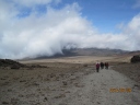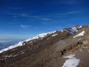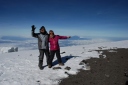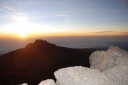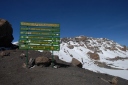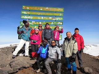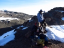 | 3月8日22時起床。軽い食事とティーをすませ、23時30分にヘッドランプの灯りを頼りに ウフルピークを目ざして出発。 暗い道のりなので、どこをどう歩いているのか、分からなかったが、 途中朝日の出を見た時は、嬉しかった。 砂れきの急斜面につけられた、ジグザグの道を登り、火口ふちの頂上・ギルマンズポイント(5,682m) に登頂。ニッコリと写真に納まった。 これからが目的地ウフルピーク。雪の火口ふちを滑らない様に、一歩一歩注意しながら辿った。 休憩の時は、ほんのちょっとずつ、甘いものを口にした。 ステラポイントを通過し、雪道をゆっくりゆっくり歩きながらウフルピークの看板と氷河が見えた時は、 嬉しかった。 ウフルピーク(5,895m)に到着。何枚も写真を撮った。そして、氷河の前で、現地ガイドさんが、 抱き上げて身体をぐるぐる廻してくれた。山頂を十分楽しんだ後、ホロンボハットへ向けて下山。 途中、ギボハットで昼食を摂る。まだか、まだか・・・と思う程、道のりは長く、ホロンボハットに 到着した時は、ホッと、した気分と懐かしさが交互にいりまじった。 夕食時には、お待ちかねのお酒も飲んだ。 まだ、山中一日残っているのに満足感が漂っていた。 |