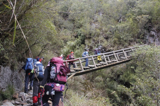 橋の上にも下にもシャクナゲの大きな木が見えて