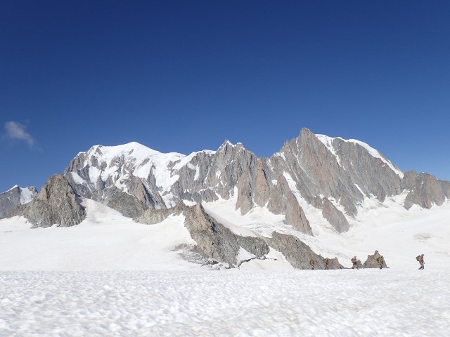 エルブロンネル下雪原を行く、東側からのモンブランを仰ぐ