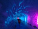 | 有志4人でモンタンヴェールに行った。 9時にホテルのロビーに集合。10分程歩いた所にモンタンヴェール行きの登山列車の駅があった。 赤い可愛い電車に乗った。眼下にシャモニーの町を見ながら、ゴットンゴットンと約20分揺られて、 標高1,913メートルのモンタンヴェールに到着した。 目の前に広がる氷河メール・ド・グラスとドリュー峰は迫力満点、奥には、屹立するグランドジョラス北壁も見えた。 展望台からの風景を堪能した後、ゴンドラに乗って下る。さらに階段をかなり歩いて降ると、 氷河をくりぬいた洞窟に達する。内部はライトアップされ、人が十分すれ違える広さのトンネルが 迷路のように続いていた。ブルーアイスの洞窟は、神秘的であったが、 氷河は年々縮小後退しており、この事が気になった。 |