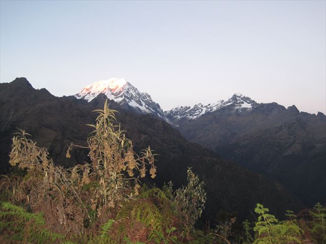 朝日が照り輝くサンカルタイ峰(6,264m)とウマンタイ峰(5,459m)